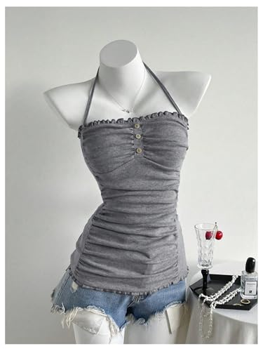 • Feature: Frill Trim, Halter Neck, Button Front, Spaghetti Strap, Sleeveless, Backless, Slim Fit, Tank Tops for Women