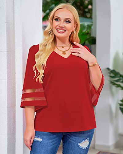 LookbookStore Women's V Neck Mesh Panel Blouse 3/4 Bell Sleeve Loose Top Shirt 3