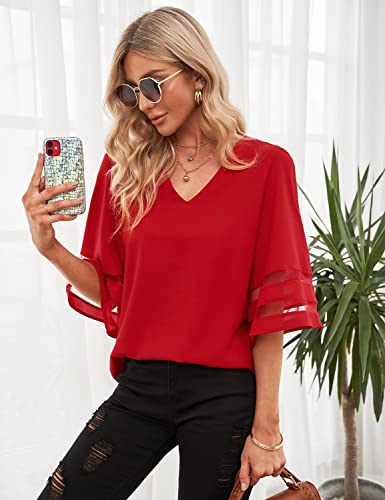 • 3/4 Flare bell sleeve. Solid color. Summer tops for women. Women summer tops. 3/4 sleeve chiffon blouses. Black work tops for women. Women 3/4 sleeve top, work shirts business blouses. LookbookStore womens v neck mesh panel blouse.
