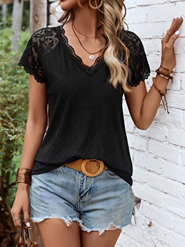 HOT ! SweatyRocks Women's Floral Lace Short Sleeve Raglan Top Casual V Neck Pullover Plain Tee Shirt