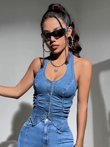 Floerns Women's Sleeveless Button Up Denim Halter Tops Ruched Asymmetrical Hem Tank Tops 5