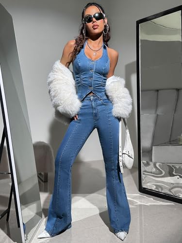 More information about Floerns Women's Sleeveless Button Up Denim Halter Tops Ruched Asymmetrical Hem Tank Tops