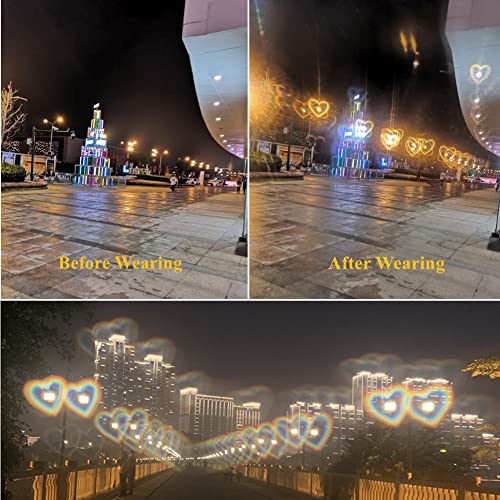 • Magic Heart Effect Design -- When you stand in front of the light source and look directly at a certain light spot, the glasses will make the lights explode into rainbow Hearts! The moment you put on the heart light glasses, all the light will appear as a love-shaped light, they are so charming and exciting!