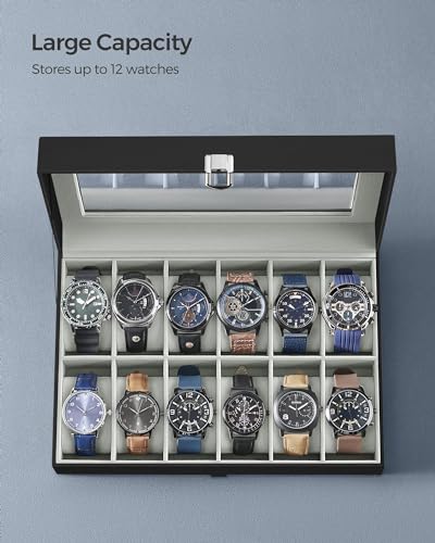 HOT ! SONGMICS Watch Box, 12-Slot Watch Case with Large Glass Lid, Removable Watch Pillows, Watch Box Organizer, Gift for Loved Ones, Black Synthetic Leather, Gray Lining UJWB12BK