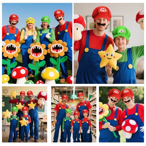 4 Set Super Bros Halloween Costume for Adult,Super Bros Hats Accessories Mary Luigi Caps, Mustaches, Suspenders, Gloves Buttons Set 4
