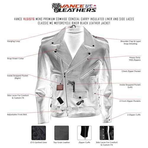 Vance Leather Mens Premium Cowhide Conceal Carry Insulated Liner Side Laces Classic MC Motorcycle Biker Black Leather Jacket 1