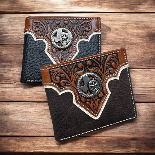 HOT ! Men’s Short Leather Wallet – Floral Tooled Inlay with Texas State and Star Concho – Western Cowboy Bifold Wallet for Texans, Ranchers & Patriotic Gifts