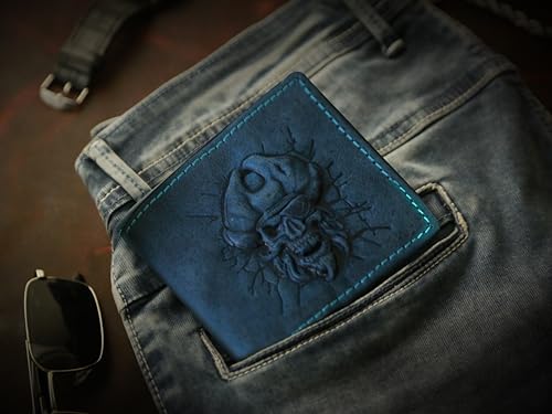 Wallet For Men- 3D Embossed Pirates Captian Skull Themed Design Bifold Vintage Distressed Genuine Leather Wallet With Two Cash Pockets And Six Card Slots (Blue) 3