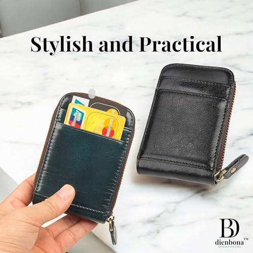 HOT ! 13 Card Slots Genuine Leather Minimalist Zipper Accordion Purse, Slim Multi Pockets Zip Around Wallet with Key Ring Strap, Compact Card Organizer with Key Ring Strap (Black)