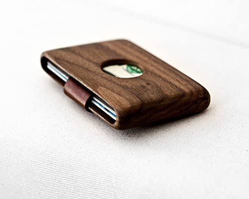 IPPINKA Minimalist Wallet for Men or Women - Wood Wallet - Walnut Wood with Leather Pull-Out Strap - Slim Card and Money Bill Holder 5