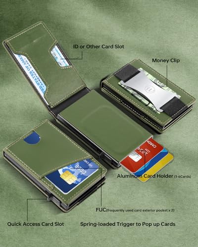 • 【Holds 9-12 Credit Cards and ID Window】12 Cards can be inseted in this lightweight and compact pop up wallet, with 2-4 additional cards (1 ID windows included) in the PU cover, another 6 cards can be stored in the aluminum popup champer of the wallet, 1 or 2 cards can be inserted in outside of the leather champer.