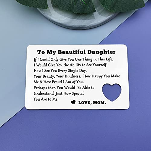 • 【Encouragement Gift for Daughter】The words engraved on the engraved wallet insert card are so meaningful --"To My Beautiful Daughter If I Could Only Give You... Thing in This Life, I Would Give You The Ability yo See Yourself How I See You Every Single Day. Your Beauty, Your Kindness, How Happy You Make Me & How Proud I Am of You. Perhaps Then You Would Be Able to Understand Just How Special You Are to Me. Love, Mom. Perfect gift to give your daughter on the special day, or just a cute gift for her.