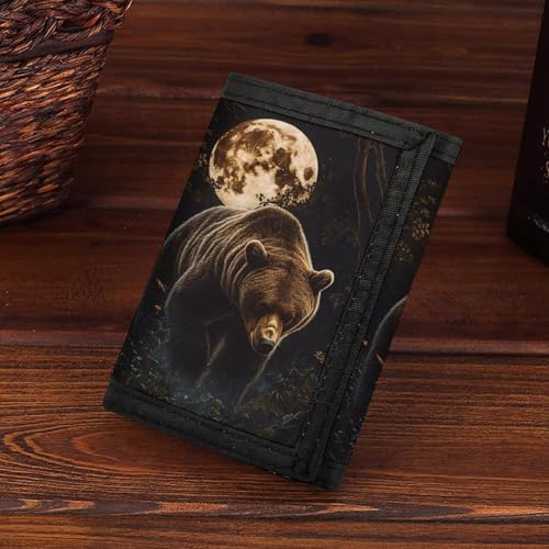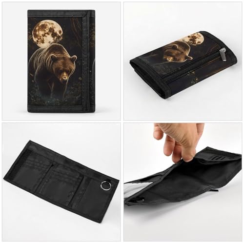HOT ! Grizzly Bear Walking Through Forests Trifold Wallets for Men with ID Window Thin Card Holder with Zipped Coin Pocket and Keychain