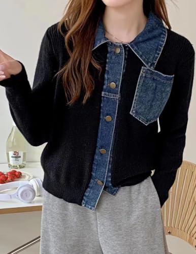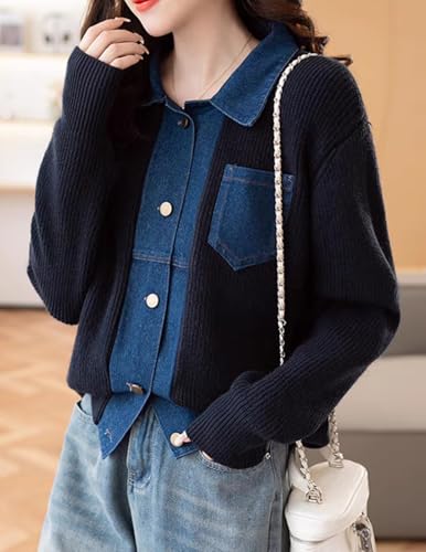• Design:Women's sweater cardigan, sweater with denim patchwork, fashionable and elegant, front placket, button placket, medium weight, above the waist, two front pockets, suitable for any body type, can be perfectly matched with all new season outfits.