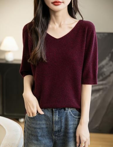 Women's V-Neck 100% Merino Wool Spring Fall Winter First-Line Ready to Wear Seamless Knit Shirt Short Sleeve Sweater 5