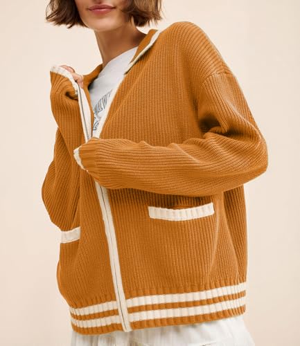 CHARTOU Casual Knit Zip Up Sweater for Women 2025 Fall Outfits Contrast Trim Open Front Cardigan Sweater Outwear Coats 2
