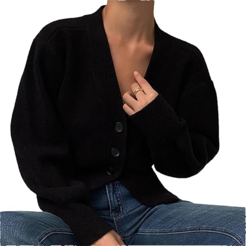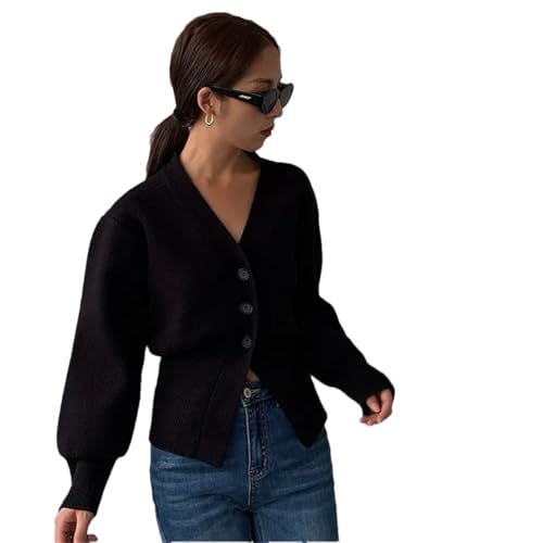 More information about Women's V-Neck Sweater, Lantern Sleeve Short Sweater, Solid Color Retro Cardigan