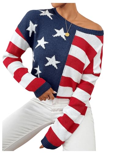HOT ! SweatyRocks Women's American Flag Sweater USA Star Striped Knit Sweater Crew Neck Pullover Long Sleeve Top