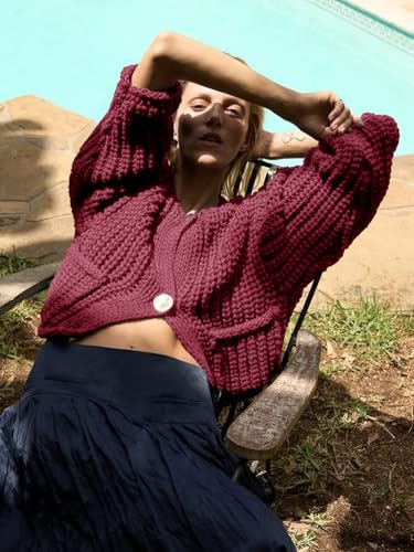 HOT ! Saodimallsu Womens Button Up Sweaters Fall Chunky Knit Cropped Trendy Crewneck Loose Cardigan with Pockets