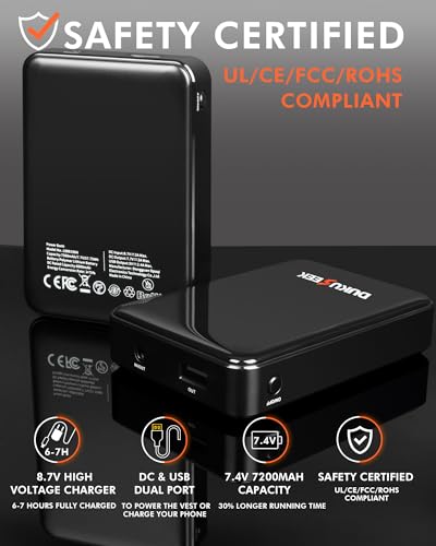 • ★【7.4V 7500mAH Rechargeable Lipo Battery】- The DUKUSEEK rechargeable heated vest is equipped with a premium 7.4V 7500mAh large capacity battery, comparing with other 5V batteries, the 7.4V one offers more power and longer working time to all the heating areas.
