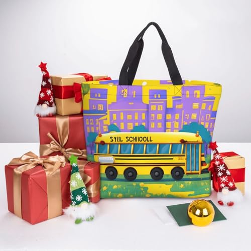 School Bus Print Tote Bags, Large Capacity Zipper Shoulder Bag, For Shopping, Work, Daily 5