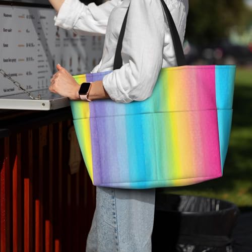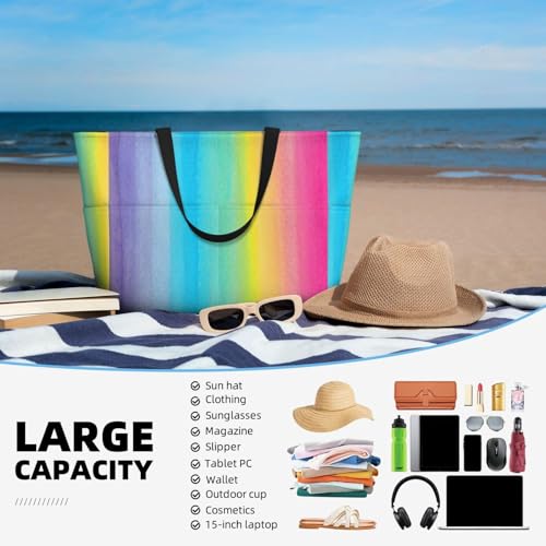 HOT ! Pretty Watercolor Rainbow Design Extra Large Beach Tote Bag – Beach Vacation Essentials With 7 Pockets, Durable Polyester Carryall For Swim, Pool & Camping