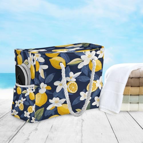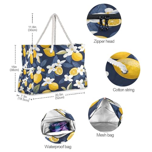 HOT ! ATTX Lemon and Flowers Beach Bags for Women - Large Beach Bags with Zipper Waterproof Sandproof Swim Pool Bag Large Tote#307