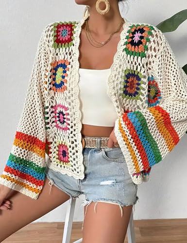 HOT ! Womens Vintage Crochet Granny Square Cardigan Floral Knitted Y2K Retro Long Sleeve Open Front Boho Chic Sweater