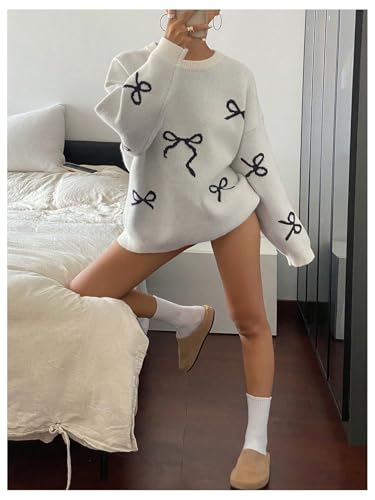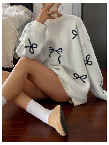 Women's Bow Print Sweater Long Sleeve Crew Neck Knit Oversized Pullovers Sweaters 5