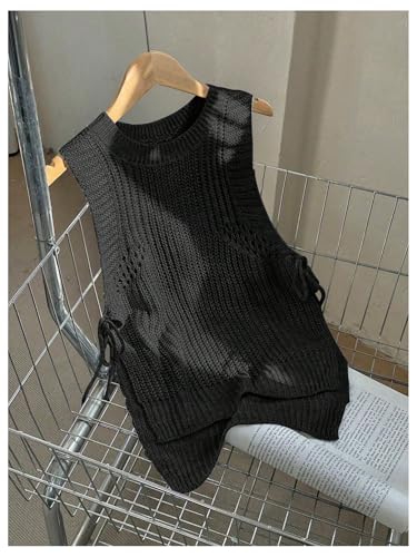 • Features: Solid, ripped, sleeveless, crew neck, drawstring, slit hem sweater vest for women