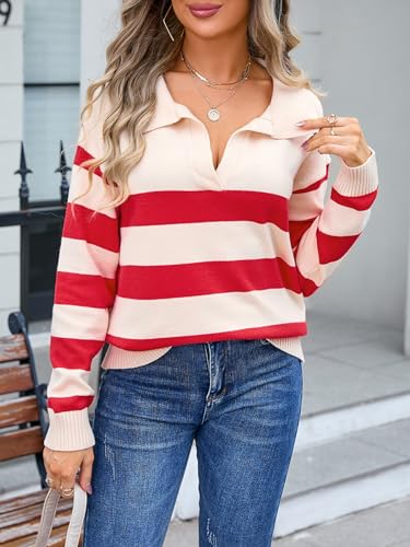 Striped Sweaters for Women Trendy Casual Knit Long Sleeve V Neck Lapel Collared Polo Pullover Tops 2