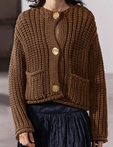 HOT ! Arssm Womens Cropped Cardigan Sweaters Chunky Open Front Button Down Knit Sweater Long Sleeve Loose Cardigan Outerwear(Brown-S)