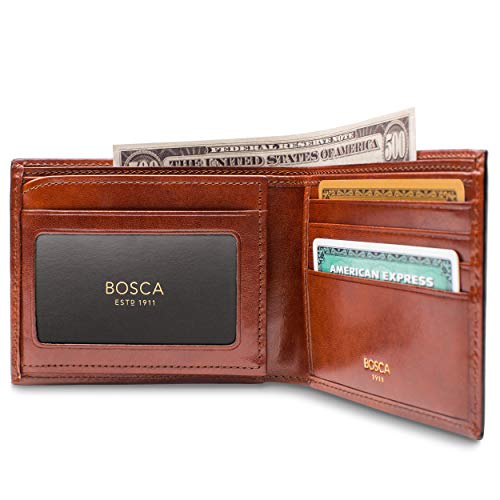 HOT ! Bosca Men's Old Leather Bifold Wallet with ID Window and Card Slots - Italian Leather, Durable and Stylish - Amber Brown
