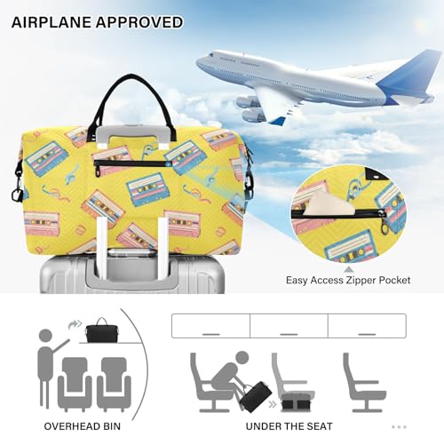 HOT ! Music Tape Yellow Travel Duffel Bag for Men Women with Makeup Bag Weekend Overnight Carry On Bags for Travel Hospital Gym