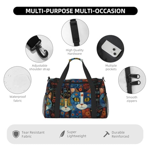 • Pocket Layout: Cartoon Cat print Travel Duffle Bag has one main pocket with double-headed zippers for easy access. An internal zip pocket, adjustable strap (70 - 120cm), 65cm handles, side mesh and reinforced webbing with buckle, offering organized storage.
