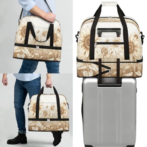 Travel Duffel Bags Vintage Sunflower Prints Foldable Weekender Bags for Women with Shoes Compartment Waterproof & Tear Resistant Carry on Overnight Luggage Duffel Bag Shoulder Sports Tote Bag 2