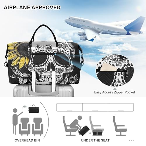 Large Travel Duffel Bag, Yellow Sunflower and Skull Sports Tote Gym Bag, Shoulder Weekender Overnight Bag for Women Men, Carry On Luggage with Toiletry Bags 4
