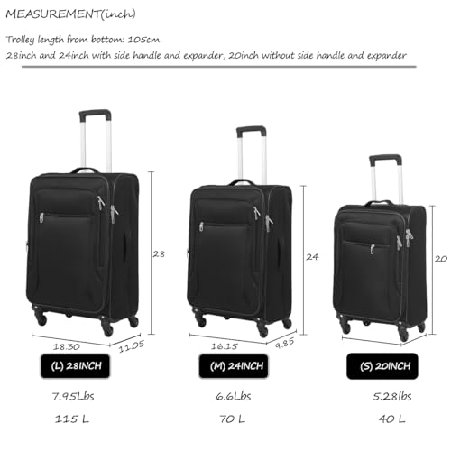 • 【3pcs Softside Luggage Sets】: 3pcs softside luggage Made of 100% high-density Polyester, high abrasion resistance to keep the softside softshell luggage beautiful. 20 inch carry-on is suitable for US airline cabin luggage according to IATA standards,it is the most suitable to carry around, The 24in & 28in can expand 20% space to allow you to pack more items and compression keeps clothing neatly pressed . Capacity: 20in: 40L 24in: 70L 28in: 115L