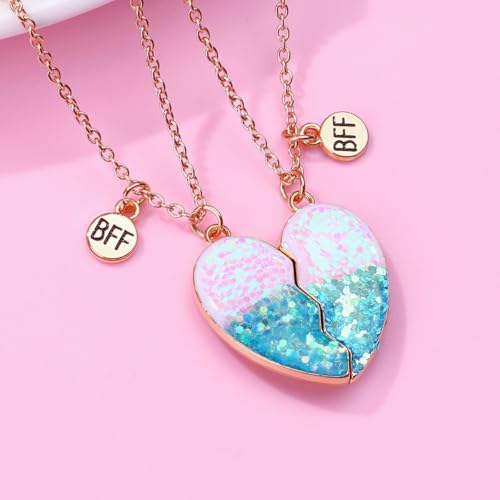 • 💕BFF Necklace💕Our best friend necklace set includes 2 pieces matching heart pendant, very beautiful sweet mermaid blue sequins blended inside shining in every angle. Attraction makes the 2 matching heart necklace stay complete together while best friend wearing them and getting closer, the little BFF hang beside the heart to secure your bond, super cute and fun.