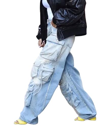 Sexyshine Women's High Waist Cargo Jeans Pants Y2K Baggy Loose Distressed Ripped Long Denim Pants with Multi Pockets 6