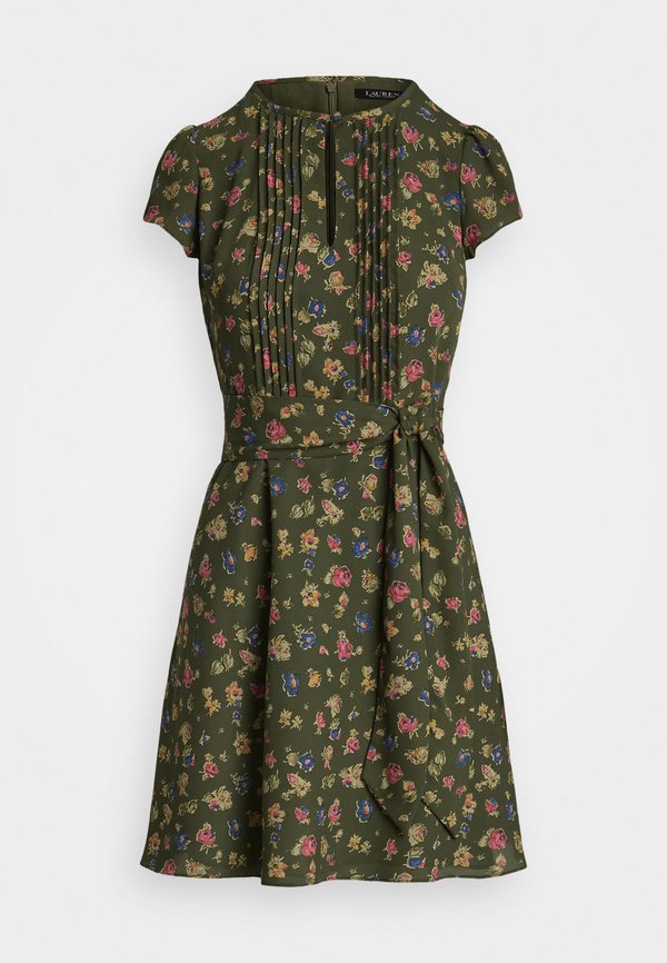 HOT ! FLORAL BELTED GEORGETTE PINTUCKED DRESS - Day dress - olive