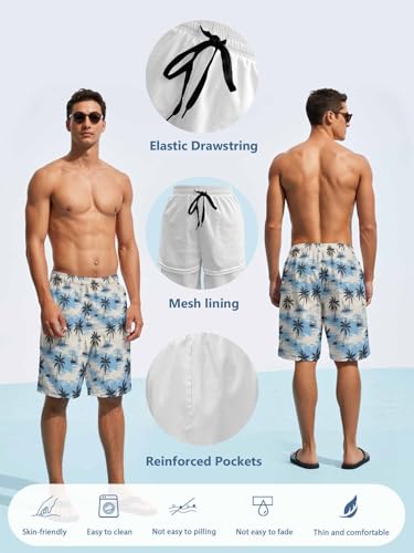 Mens Swim Trunks with Compression Liner,Palm Trees Surfing Men's Inseam Board Shorts Quick Dry Bathing Suit for Men/Boys 7