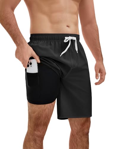 YnimioAOX Mens Swim Shorts with Mesh Lining and Men’s Swim Trunks 9 Inch with Compression Liner, Pink/Black, Small 5