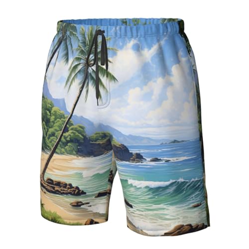 HOT ! Hawaiian Beach with Palm Trees Print Stylish Beach Shorts Swim Trunks Lightweight Breathable Summer Outdoor Activities