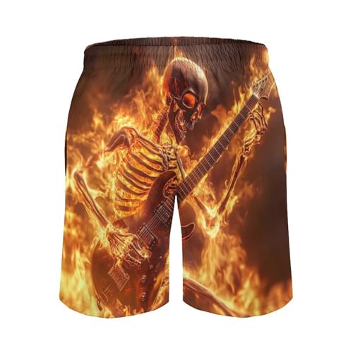 HOT ! Human Skeleton Playing Guitar in Fire Men's Swim Trunks Quick Dry Board Shorts Hawaiian Beach Shorts With Pocket