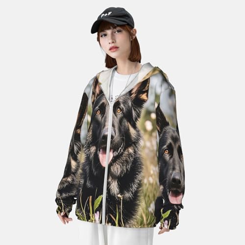 • Premium Quality Fabric: UPF 50+ sun protection jacket hooded, shield your skin from harmful sun rays. Breathable, lightweight & soft fabric makes these sun shirts performence better for hot days. The black german shepherd sun protective shirts fabric wicks away sweat and moisture, keeping you dry and fresh
