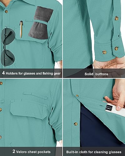 • 【Functional Design for Outdoors】 This hiking shirts have 2 chest utility pockets with sunglasses loop and pen holder slot for convenient storage; A built-in glasses cleaning cloth at the hem allows you to clean glasses or shades on the go.