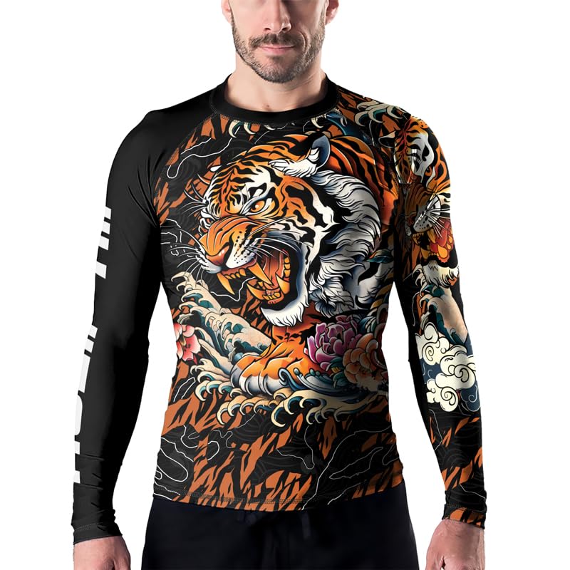 HOT ! Tiger Compression Rash Guard Men's Long Sleeve Ultra-Tight Stretchable Baselayer Shirt for BJJ Jiu Jitsu Muay Thai