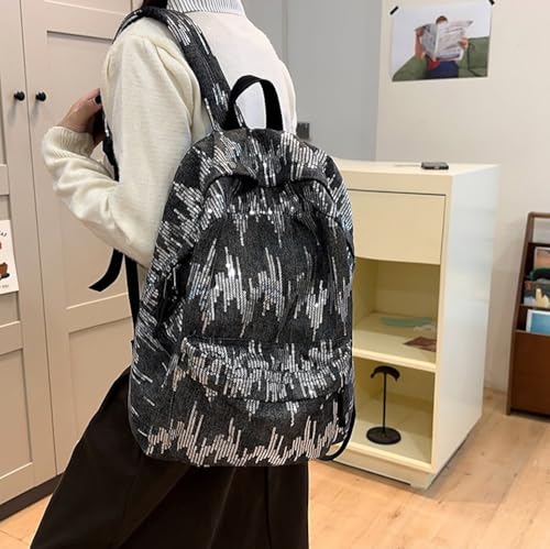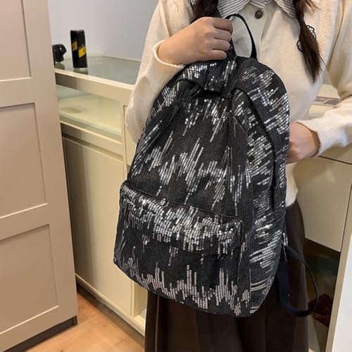 HOT ! Y2k Backpack Women Sequin Denim Backpack Silver Bling Glitter Book Bags Mochilas Casual Daypack (Black)
