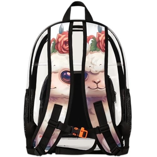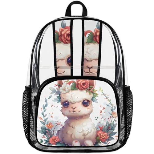 HOT ! Beautiful Alpaca Flower Watercolor Clear Backpack Stadium Approved PVC Backpacks for Adults Heavy Duty Clear Bag for Work Security Travel College